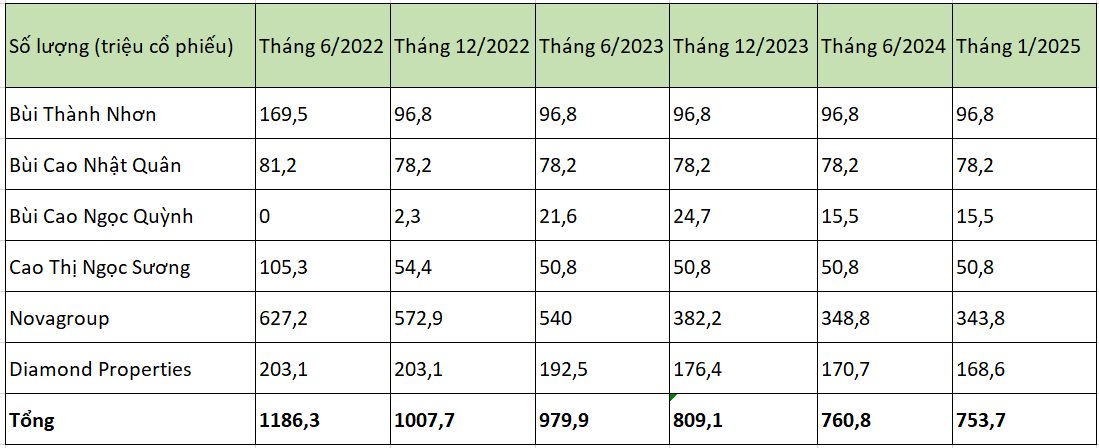Ngoài việc cổ phiếu Novaland giảm mạnh trong hơn 2 năm qua, tài sản của ông Bùi Thành Nhơn giảm một phần là do nhóm cổ đông liên quan đến ông liên tục giảm sở hữu. Hiện nay ông Nhơn cùng gia đình chỉ còn sở hữu khoảng 753,7 triệu cổ phiếu NVL, tương đương 38,6% vốn. Con số này giảm 432,6 triệu đơn vị so với giữa năm 2022.