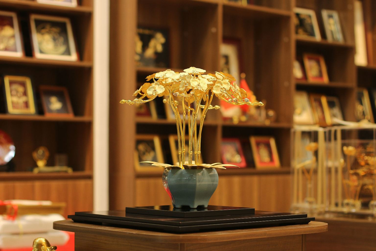 Hay chậu lan bằng đồng mạ vàng 10 nhánh, cao 52cm, có giá bán 31 triệu đồng. Tương tự, một chậu lan dát vàng khác kích thước 48x48cm có giá bán 35 triệu đồng.