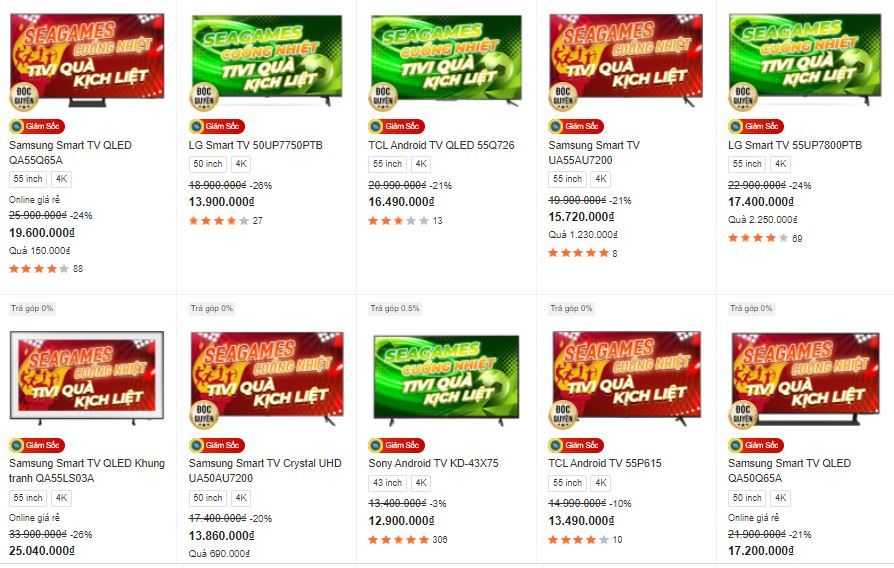 Tại website của một số hệ thống siêu thị điện máy như MediaMart, Điện Máy Xanh... nhiều mẫu TV của các thương hiệu như Samsung, LG, Sony, TCL... đều giảm giá mạnh. Khảo sát giá cho thấy hai thương hiệu Samsung và LG khuyến mại mạnh nhất với mức giảm phổ biến từ 15-30%. Nhiều mẫu TV có mức giảm giá lên tới 40-50%. Với mức giảm này, nhiều mẫu TV 4K, 8K, QLED, OLED giảm giá từ vài chục đến gần trăm triệu đồng.