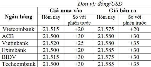 Hôm nay (30/03), tỷ giá USD/VND tại nhiều các NHTM được điều chỉnh tăng trong biên độ khoảng 20-35 đồng/USD.