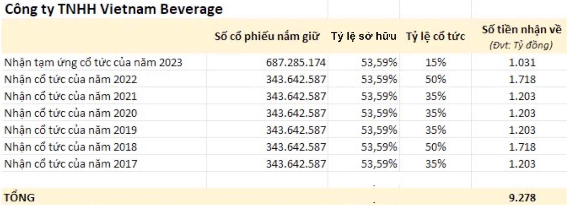 Kể từ thời điểm cuối năm 2017 tới nay, đều đặn mỗi năm doanh nghiệp của tỷ phú người Thái đã bỏ túi hàng nghìn tỷ đồng “tiền tươi” từ cổ tức. Nhiều nhất là mức cổ tức của năm 2018 và cổ tức của năm 2022 với tỷ lệ 50% bằng tiền mặt, tương ứng mỗi năm có 1.718 tỷ đồng tiền cổ tức của Sabeco thuộc về Thai Beverage; còn lại các năm khác đồng loạt ở mức 35%.