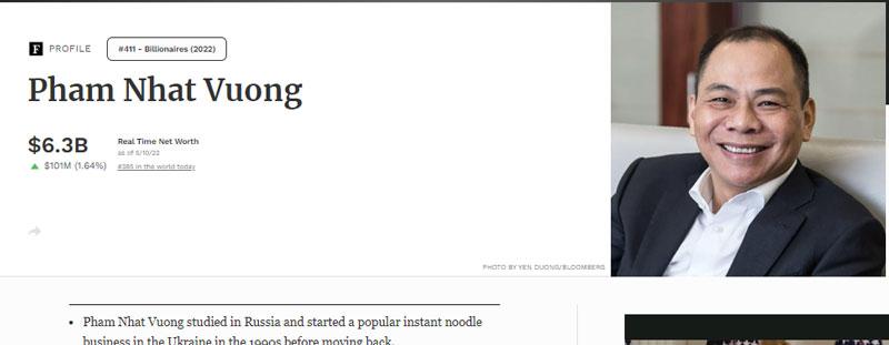 Theo Forbes, tính đến ngày 10/5/2022, ông Phạm Nhật Vượng có khối tài sản 6,3 tỷ USD.