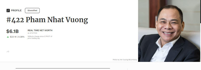 Theo Forbes, tính đến ngày 17/3/2022, ông Phạm Nhật Vượng có khối tài sản 6,1 tỷ USD.