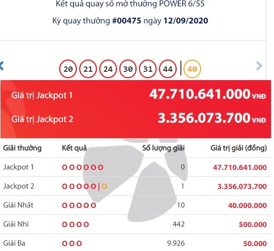Tại kỳ quay số mở thưởng thứ 475 loại hình xổ số Power 6/55 diễn ra tối 12/9, Công ty Xổ số điện toán Việt Nam (Vietlott) đã tìm được duy nhất một chiếc vé trúng Jackpot 2. Còn Jackpot 1 đang có giá trị hơn 47 tỷ đồng vẫn chưa có chủ nhân nào may mắn trúng thưởng.