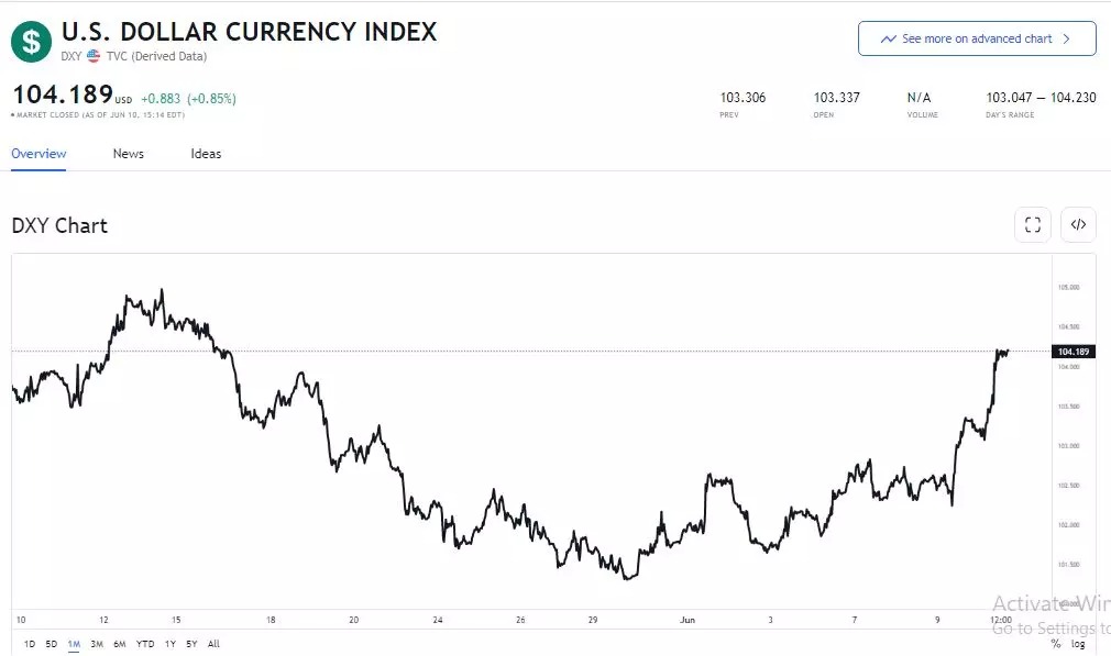 Chỉ số DXY tăng 0,8% so với mức thấp trong nhiều tuần qua, đạt 104,15 điểm vào chiều thứ 6 theo giờ Mỹ, tiến sát mức cao lịch sử ngày 13/5. Bởi, giới đầu tư Mỹ đang đổ xô mua USD khi nhận thấy lạm phát sâu hơn dự đoán. Số liệu mới công bố đang làm lu mờ kỳ vọng về việc lạm phát đã đạt đỉnh và bắt đầu hạ nhiệt. Hiện chỉ số DXY vẫn duy trì ở mức trên 104 điểm.