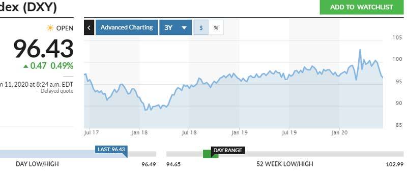 Chỉ số US Dollar Index (DXY), đo lường biến động đồng bạc xanh với 6 đồng tiền chủ chốt (EUR, JPY, GBP, CAD, SEK, CHF) có lúc lên mức 102,5 điểm (hồi tháng 3) nhưng sau đó giảm dần và hiện ở vùng thấp nhất trong 5 năm qua: khoảng 96 điểm.