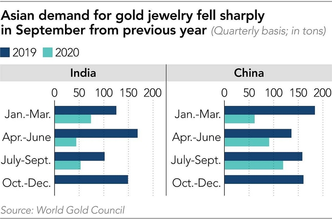 Theo Hội đồng Vàng Thế giới, nhu cầu vàng trang sức giảm 41%, xuống 904 tấn, giai đoạn từ tháng 1 đến tháng 9, so với cùng kỳ năm 2019. Trong ba quý, nhu cầu vàng trang sức giảm 57% ở Ấn Độ và 43% ở Trung Quốc.