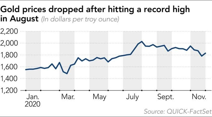 Ngày 30/11, giá vàng tiêu chuẩn tại New York là 1.790 USD mỗi ounce, giảm 13% so với ngày 6/8, khi nó đạt kỷ lục 2.069 USD. Vào ngày 10/12, giá vàng là gần 1.838 USD mỗi ounce.