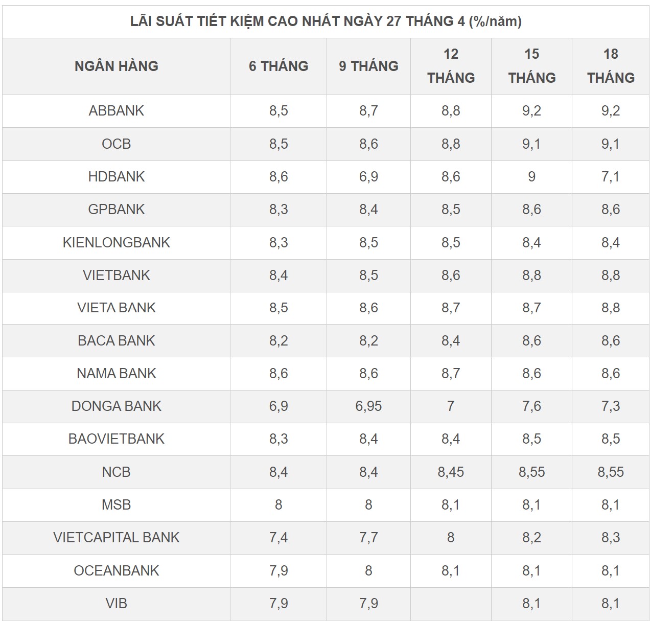So với ngày hôm qua (26/4), lãi suất huy động online kỳ hạn 6 - 9 tháng đã tăng 0,5% lên 8,4%/năm. Lãi suất kỳ hạn 12 tháng cũng được NCB tăng từ 7,95% lên 8,45%/năm. Đây cũng là mức lãi suất tiền gửi các kỳ hạn từ 10-13 tháng.