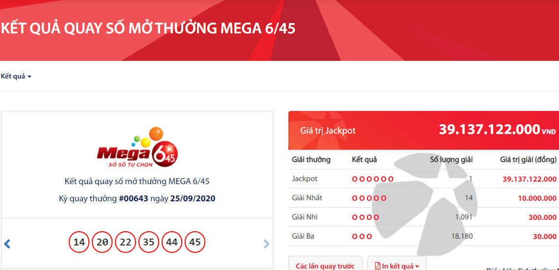 Dãy số may mắn trong kỳ quay diễn ra vào tối nay là: 14 - 20 - 22 - 35 - 44 - 45.