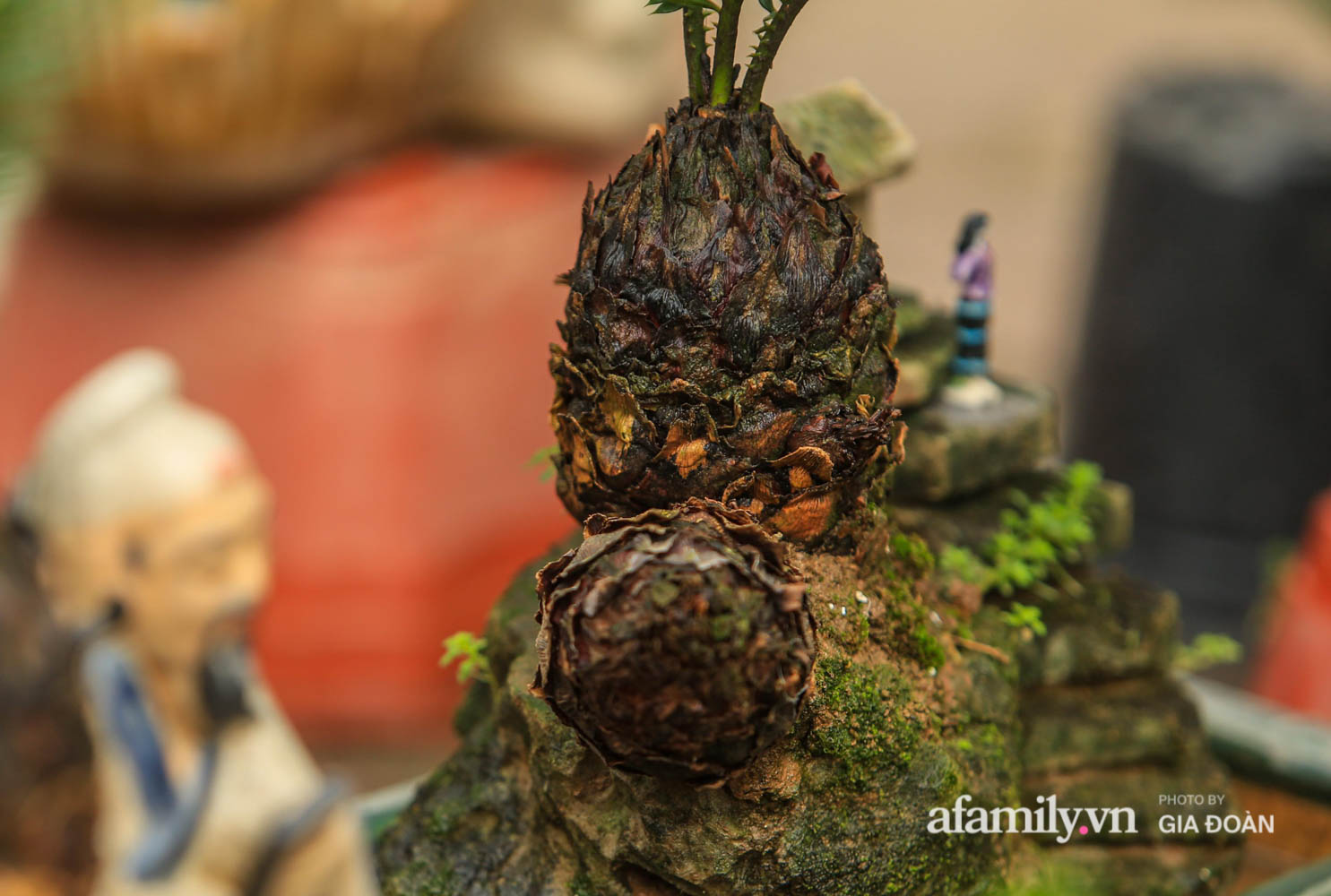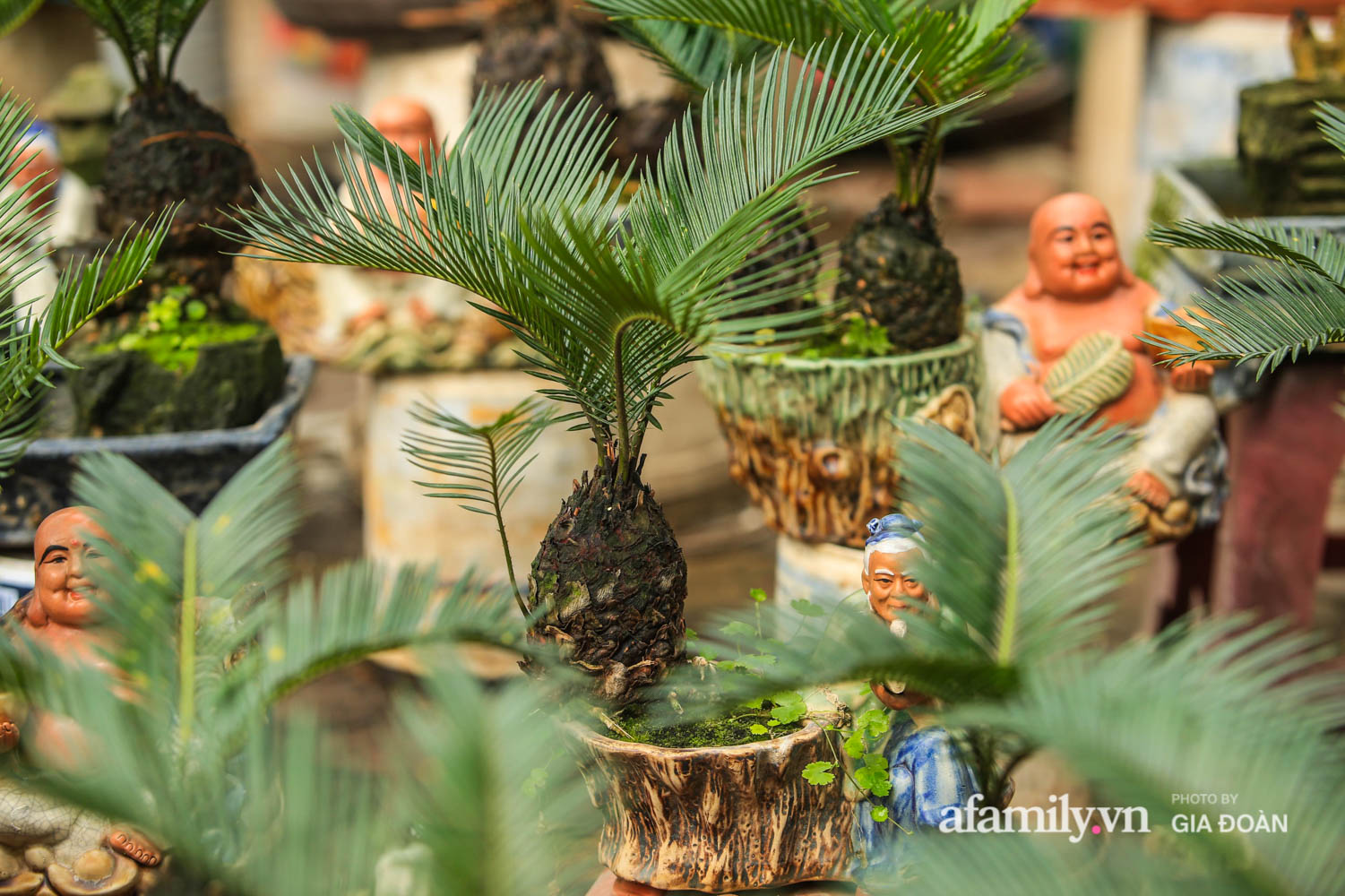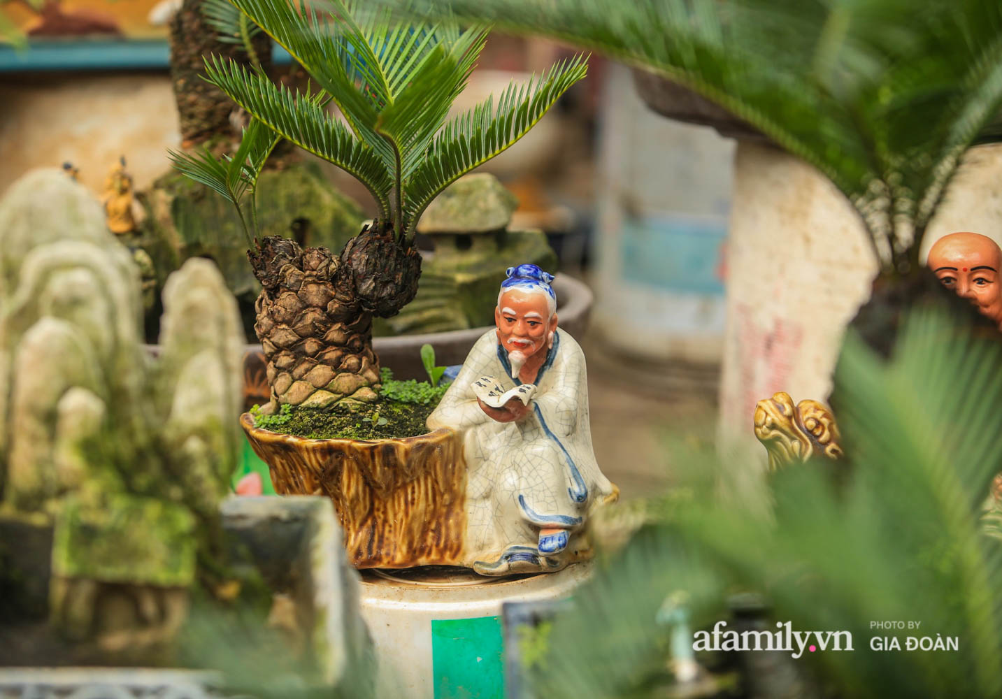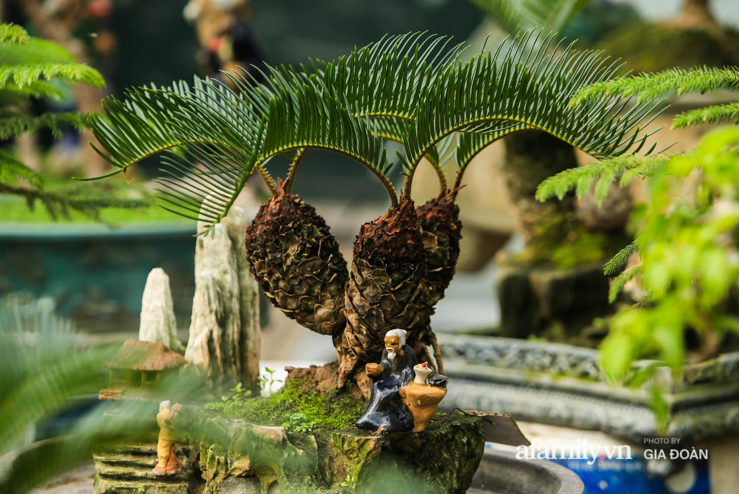 Cũng theo chia sẻ của nghệ nhân nhờ kích thước nhỏ mà vạn tuế mini bonsai thích hợp trang trí được nhiều vị trí trong nhà mỗi chậu cây đều có tên gọi riêng và được gắn thêm những bức tượng nhỏ sinh động.