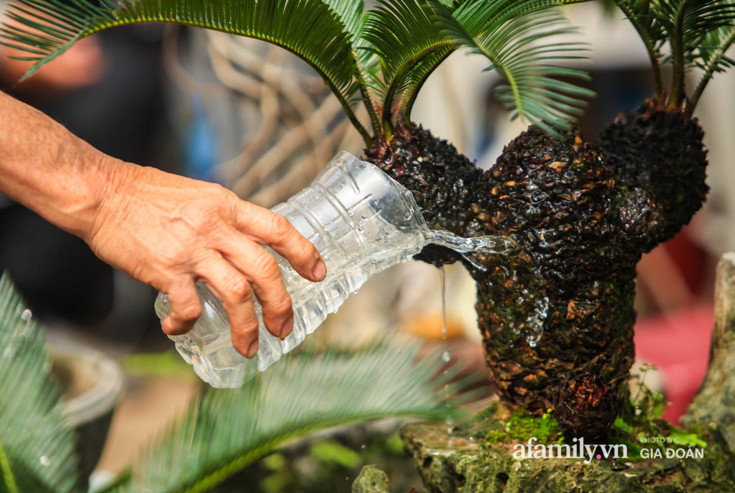 Theo lời ông Toàn, điều hay nhất của chậu cảnh đó là vạn tuế bám trên đá, hút nước dưới chậu để sống chứ không cần chăm sóc gì quá kỹ lưỡng. Việc lựa chọn đá để trồng vạn tuế là một trong những khâu rất cầu kì.