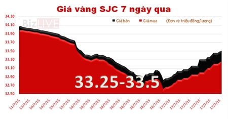 Đến chiều ngày thứ Năm, kim loại quý tiếp tục mất đà và để mất mốc 33 triệu đồng/lượng, xuống mức thấp nhất kể từ năm 2010. Chỉ tính riêng trong 3 phiên này, mỗi lượng vàng miếng SJC đã giảm 1,13 triệu đồng/lượng chiều mua vào và 1 triệu đồng/lượng chiều bán ra. So với thời điểm đầu năm, giá vàng SJC giảm 2,08 triệu đồng/lượng, tương đương giảm gần 6%.