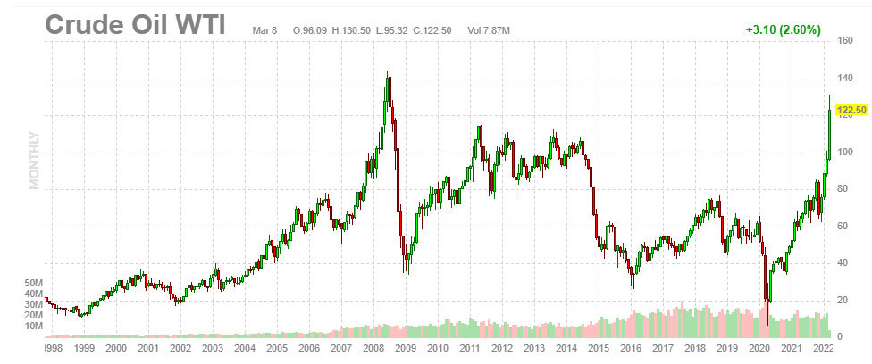 Giá vàng và dầu trên thế giới vừa trải qua một phiên tăng hiếm có. Mở cửa phiên đầu tuần, giá dầu thô có lúc tăng gần 20% lên gần ngưỡng 140 USD, trong khi vàng tăng vọt vượt ngưỡng 2.000 USD/ounce sau khi có thông tin Quốc hội Mỹ đang bàn thảo một dự luật cấm nhập khẩu dầu và khí đốt từ Nga..