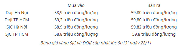 Mở cửa thị trường ngày hôm nay (22/11), giá vàng 9999 đã giảm 600 nghìn đồng so với kết thúc phiên giao dịch cuối tuần, mất mốc 60 triệu đồng/lượng.
