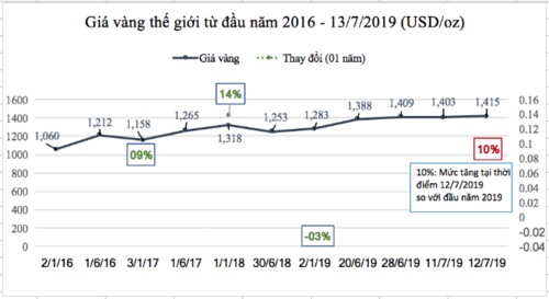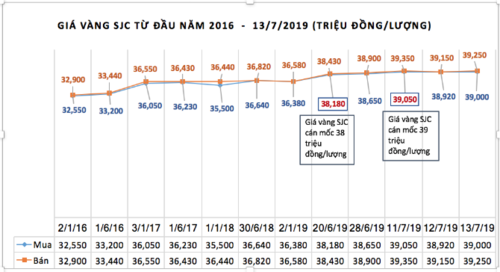 Đến thời điểm 13/7/2019, giá vàng trong nước đang thay đổi cùng chiều với giá vàng thế giới khi tăng được 7,4% từ đầu năm đến nay và đang xoanh quanh 39 triệu đồng/lượng.