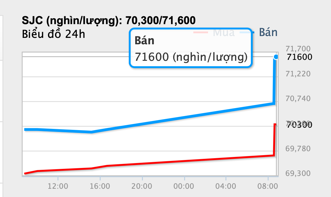 Đến 8 giờ 45, Công ty Vàng bạc Đá quý Sài Gòn (SJC) niêm yết giá vàng SJC mua vào 69,8 triệu đồng/lượng mua vào, 71 triệu đồng/lượng bán ra.