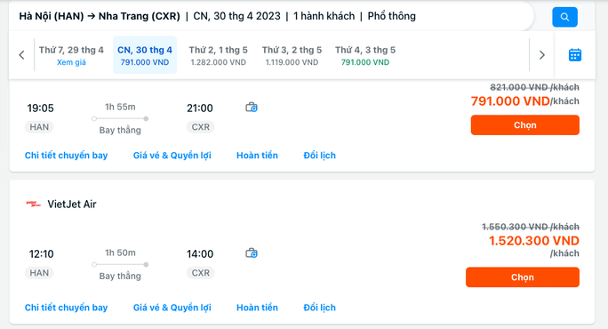 Đáng chú ý, một số chặng bay đang ế vé và giảm giá rất sâu. Thậm chí, có hãng đang mở bán vé chặng Hà Nội đi Nha Trang ngày 30-4 với giá chỉ từ 791.000 đồng/lượt (đã gồm thuế, phí).