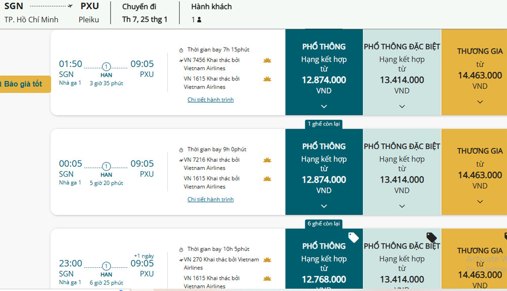Đặc biệt, chặng bay TPHCM- Pleiku tại Vietnam Airlines cũng hết sạch vé bay thẳng. Hành khách nếu muốn mua vé về quê ăn Tết phải chấp nhận bay vòng qua Hà Nội, mất ít là 6-7 tiếng, nhiều lên tới 9-10 tiếng để di chuyển. Có chuyến, khách phải bay đêm muộn từ 23h hôm trước, 9h sáng hôm sau mới hạ cánh. Bình thường, bay thẳng chặng này chỉ mất 1 tiếng 10 phút.