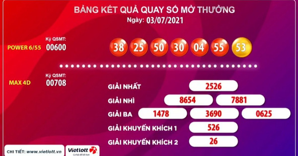 Lúc 19 giờ ngày 3-7, Công ty Xổ sổ điện toán Việt Nam (Vietlott) công bố tại kỳ quay số chiều cùng ngày có 1 vé loại hình Power 6/55 trúng giải Jackpot 1 trị giá 53,5 tỉ đồng.