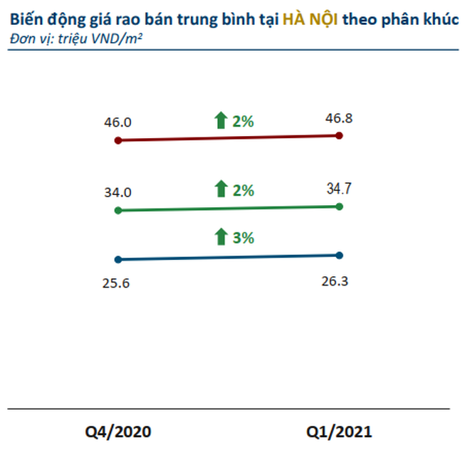 Tại thị trường Hà Nội, phân khúc bình dân được rao bán trung bình ở mức 26,3 triệu đồng/m2, căn hộ trung cấp được rao ở mức 34,7 triệu đồng/m2 và cao cấp ở mức 46,8 triệu đồng/m2.