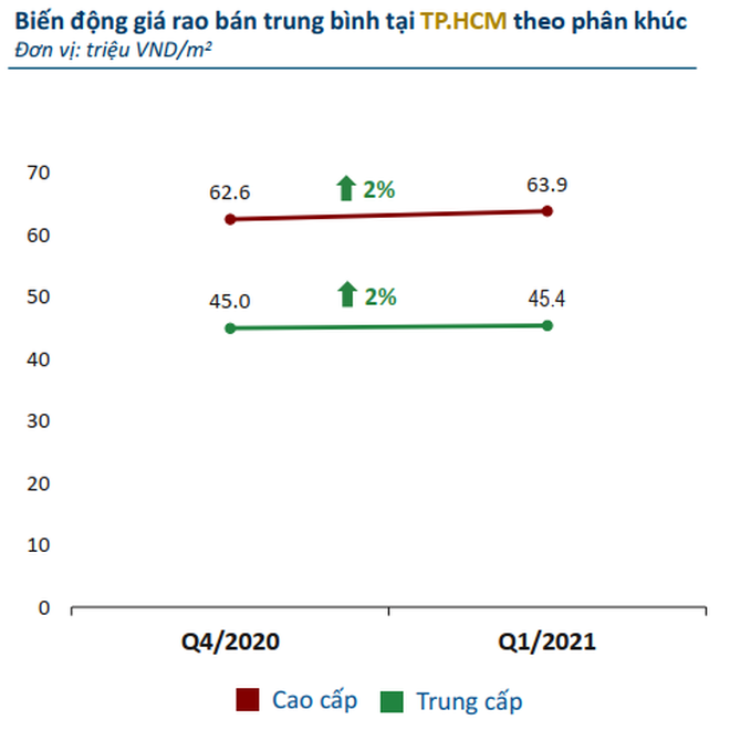 Giá rao bán nhà tại TPHCM đang ở mức 45,4 triệu đồng/m2 với phân khúc trung cấp và 63,9 triệu đồng/m2 với phân khúc cao. TPHCM không còn căn hộ bình dân, theo dữ liệu từ Batdongsan.com.vn.