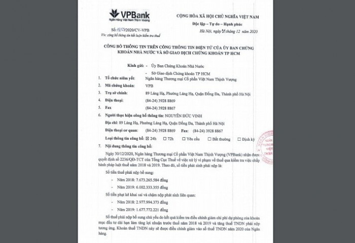 Theo quyết định 2236/QĐ-TCT được Tổng cục Thuế ban hành về việc xử lý vi phạm về thuế qua kiểm tra việc chấp hành pháp luật thuế năm 2018 và 20219 của VPBank, Tổng cục Thuế đã yêu cầu ngân hàng này phải nộp bổ sung số thuế của năm 2018 là hơn 7,6 tỷ đồng, của năm 2019 là hơn 6 tỷ đồng.