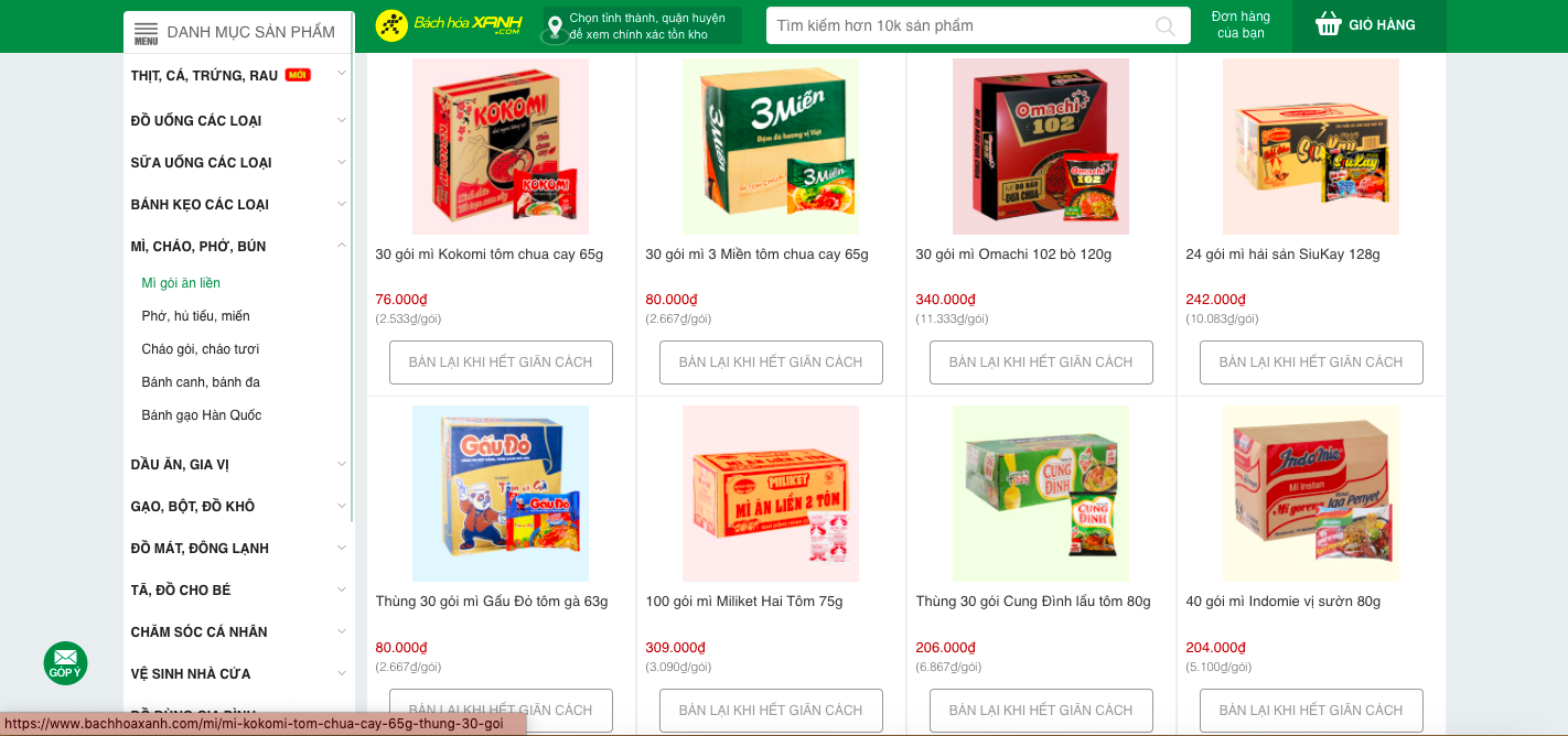 Trên website của hệ thống Bách Hoá xanh, các mặt hàng đồ khô cũng được thông báo hết hàng và sẽ bán lại sau dịch COVID-19.