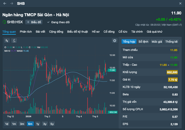 Cổ phiếu SHB hiện được giao dịch ở mức 11.850 đồng, biến động trong vùng tích lũy thời gian qua.