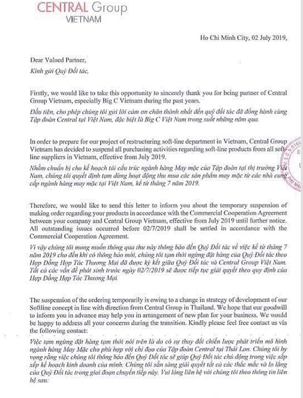 "Kể từ tháng 7 cho đến khi có thông báo mới, chúng tôi sẽ tạm thời ngừng đặt hàng của đối tác theo Hợp đồng Hợp tác Thương mại ký kết giữa đối tác và Central Group Việt Nam", thông báo của Central nêu rõ.