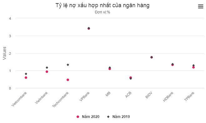 Thống kê tại chục nhà băng quy mô lớn nhất tới cuối năm 2020, tỷ lệ nợ xấu đều giảm hoặc đi ngang so với đầu năm. Kết quả này một phần nhờ Thông tư 01 cho phép các ngân hàng giữ nguyên nhóm nợ với khách vay bị ảnh hưởng bởi dịch bệnh, nhưng cũng một phần nhờ các ngân hàng đã phải trích chi phí dự phòng rủi ro để xoá nợ ngay trong kỳ.