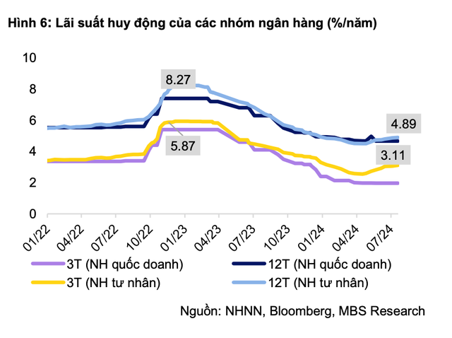 Một trong những yếu tố thúc đẩy lãi suất gửi tiết kiệm đi lên, theo MBS, là do tín dụng đang tăng nhanh gấp 3 lần so với tốc độ tăng của huy động vốn. Số liệu của Ngân hàng Nhà nước đến hết tháng 6, tăng trưởng tín dụng của hệ thống đạt khoảng 6%, tăng mạnh trong bối cảnh 2 tháng đầu năm tín dụng tăng trưởng âm.