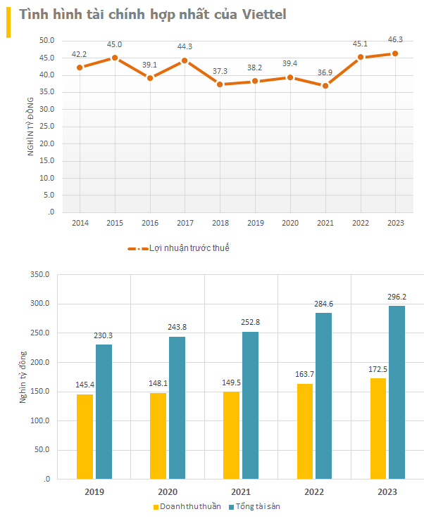 Viettel cho biết, năm 2023 là năm Viettel đạt được thành tựu trên tất cả các lĩnh vực viễn thông trong nước, viễn thông nước ngoài, chuyển đổi số, nghiên cứu sản xuất & logistic. Tại thời điểm 31/12/2023, tổng tài sản của Viettel ở mức 296.249 tỷ đồng, tăng 11.987 tỷ đồng so với hồi đầu năm.