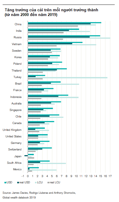 Báo cáo Của cải Toàn cầu 2019 (Global Wealth 2019) của Credit Suisse cho biết, Việt Nam đứng thứ 4 về tốc độ tăng trưởng của cải trên mỗi người trưởng thành. Trung Quốc đứng ở vị trí hàng đầu, theo sau là Ấn Độ và Nga.