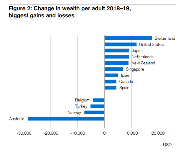 Xét về tốc độ tăng giàu có trên mỗi người trưởng thành, Thụy Sĩ là quốc gia đứng đầu bảng xếp hạng năm nay, với mức tăng trưởng thu nhập lên tới 17.790 USD. Úc nằm ở cuối của thang điểm, với mức giảm 28.670 USD/người lớn, phần lớn là do ảnh hưởng của tỷ giá hối đoái. Úc đã mất 124.000 triệu phú USD sau khi sụt giảm tài sản trung bình và là quốc gia duy nhất ghi nhận mức giảm giá bất động sản tới 6%.