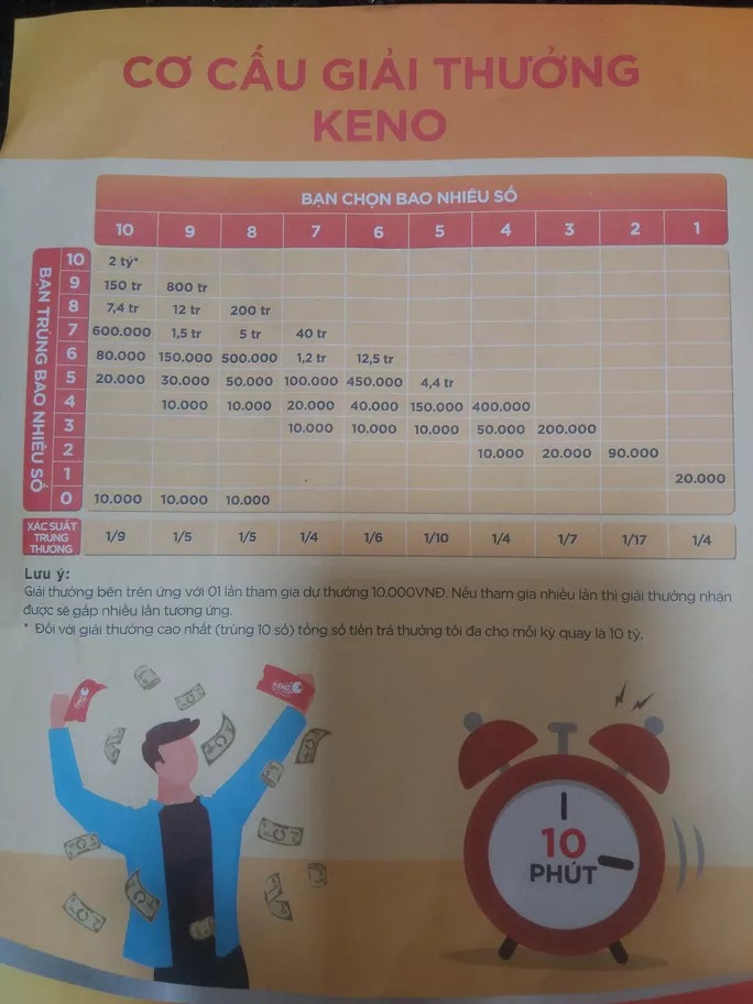 Đặc biệt, người chơi mua vé có 10 cặp số, mệnh giá 10.000 đồng. Nếu 10 cặp số của vé này trùng với 10 trong số 20 cặp số của kết quả trúng thưởng sẽ trúng 2 tỉ đồng. Còn nếu vé trúng có mệnh giá 50.000 đồng thì giá trị trúng thưởng sẽ lên tới 10 tỉ đồng.