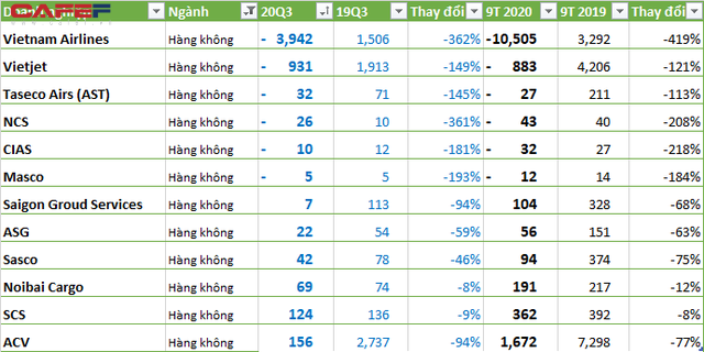 Ngoài hai hãng hàng không, nhiều đơn vị khác cũng báo lỗ trong quý 3, bao gồm CTCP Suất ăn Hàng không Nội Bài (NCS) lỗ 26 tỷ đồng, CTCP Dịch vụ Hàng không Taseco (AST) lỗ 32 tỷ đồng, CTCP Dịch vụ Sân bay Quốc tế Cam Ranh (CIA) lỗ 10 tỷ đồng, CTCP Dịch vụ Hàng không Sân bay Đà Nẵng (MAS) lỗ 5 tỷ đồng.