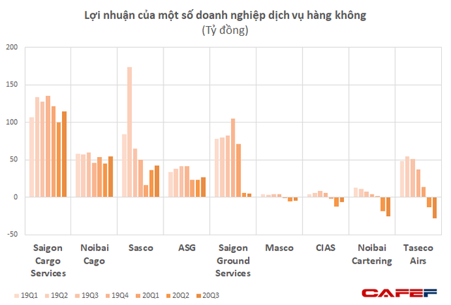 Tổng công ty Cảng hàng không Việt Nam (ACV) đơn vị quản lý vận hành hơn 20 sân bay trên cả nước ghi nhận lợi nhuận 156 tỷ đồng, giảm 94% so với cùng kỳ. CTCP Phục vụ Mặt đất Sài Gòn (SGN) cũng giảm với tỷ lệ tương tự, khiến lợi nhuận chỉ còn vỏn vẹn 7 tỷ đồng.