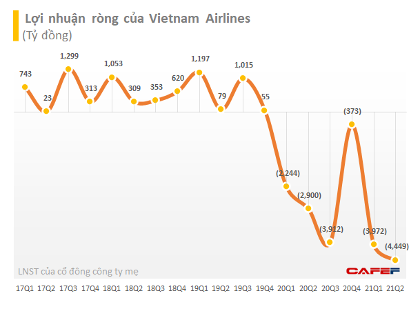 Trong 6 tháng đầu năm 2021, Vietnam Airlines lỗ ròng hợp nhất 8.421 tỷ đồng. Lỗ lũy kế tính đến thời điểm 30/6/2021 là 17.772 tỷ đồng. Điều này khiến cho hãng hàng không quốc gia âm vốn chủ hơn 2.750 tỷ đồng.