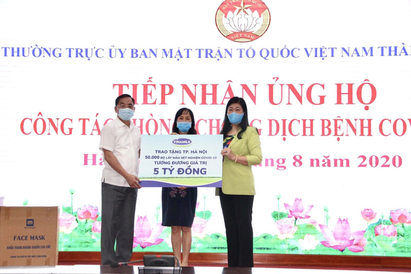 Trong ngày 11/8/2020, bà Nguyễn Thị Minh Tâm, Giám đốc Chi nhánh Vinamilk tại Hà Nội đã đại diện Công ty trao tặng 50.000 bộ lấy mẫu xét nghiệm cho đại diện của Sở Y tế và Mặt trận Tổ quốc TP. Hà Nội. Tại buổi tiếp nhận ủng hộ công tác phòng chống dịch Covid-19, ông Nguyễn Khắc Hiền - Giám đốc Sở Y tế Hà Nội cho biết: “Việc Vinamilk hỗ trợ mẫu xét nghiệm có ý nghĩa rất lớn cho Hà Nội, bổ sung lượng mẫu xét nghiệm đang còn thiếu hiện nay, đảm bảo cho Hà Nội có đủ 80 nghìn mẫu xét nghiệm PCR. Nếu các đơn vị liên quan thực hiện việc giao mẫu đúng tiến độ thì mỗi ngày Hà Nội sẽ có thể xét nghiệm 10 nghìn mẫu để tăng cường khoanh vùng dập dịch.”