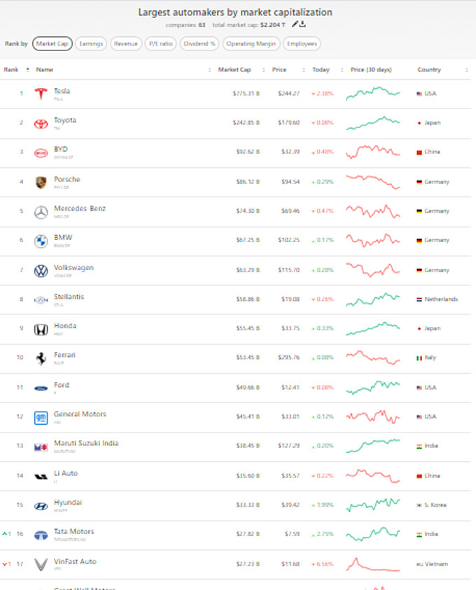 Với mức vốn hóa này, hãng xe điện của tỷ phú Phạm Nhật Vượng xuống dưới hãng xe Tata Motors của Ấn Độ và đứng thứ 17 trong các hãng xe ô tô trên thế giới. Nếu chỉ tính các hãng xe điện, VinFast đứng thứ 4 sau hãng xe Tesla của tỷ phú Elon Musk (tính tới 2/10 có vốn hóa 775tỷ USD); BYD của Trung Quốc (92,6 tỷ USD) và Li Auto của Trung Quốc (35,6 tỷ USD).