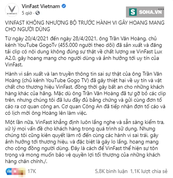Từ ngày 20/4/2021 đến ngày 28/4/2021, ông Trần Văn Hoàng, chủ kênh YouTube GogoTv (455.000 người theo dõi) đã sản xuất và đăng tải clip có nội dung không đúng sự thật về chất lượng xe VinFast Lux A2.0, gây hoang mang cho người dùng và ảnh hưởng tới uy tín của VinFast.