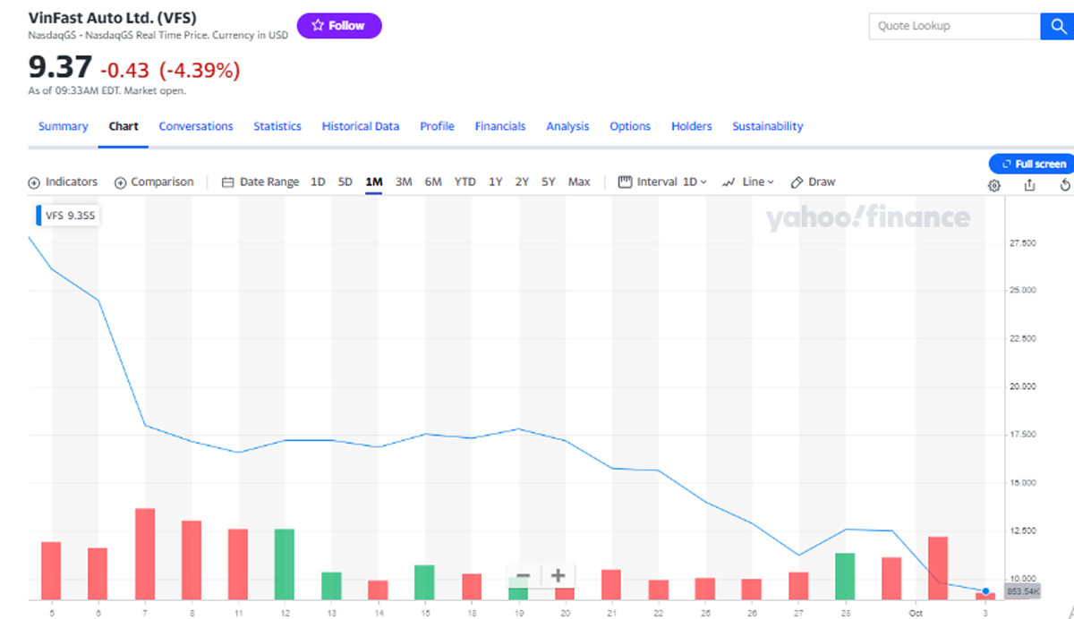 Cụ thể, tính tới 20h30 ngày 3/10 (giờ Việt Nam), cổ phiếu VFS giảm gần 4% so với phiên liền trước, xuống 9,5 USD/cp.
