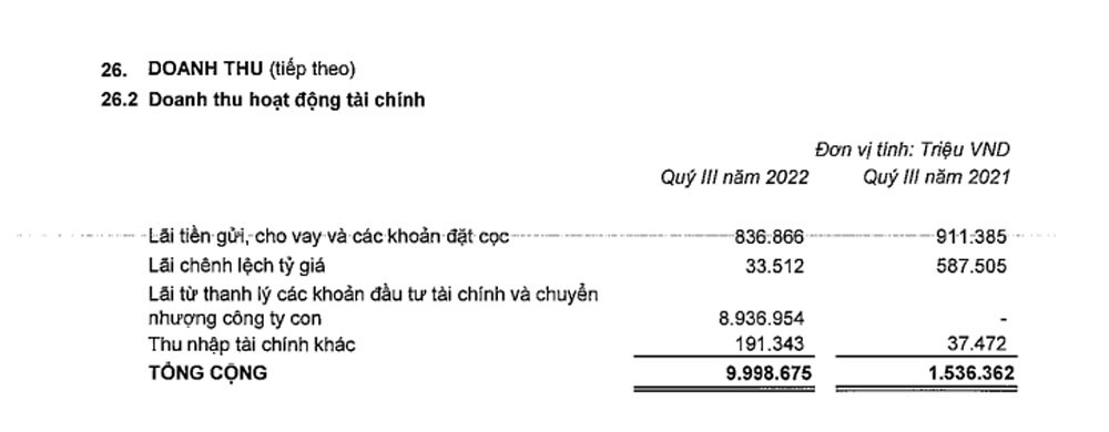 Theo báo cáo hợp nhất, trong quý III/2022, Vingroup ghi nhận doanh thu tài chính đạt gần 9.999 tỷ đồng, cao hơn rất nhiều so với mức 1.536 tỷ đồng cùng kỳ năm trước. Trong đó, có gần 8.937 tỷ đồng là lãi từ thanh lý các khoản đầu tư tài chính và chuyển nhượng công ty con. Lãi tiền gửi, cho vay và các khoản đặt cọc chưa tới 837 tỷ đồng.