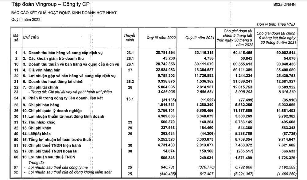 Với những biến động trên, trong quý III/2022, Vingroup ghi nhận lợi nhuận trước thuế đạt 5.252 tỷ đồng nhưng lợi nhuận sau thuế chỉ đạt hơn 506 tỷ đồng. Lợi nhuận trước thuế trong 9 tháng đầu năm 2022 đạt 8.739 tỷ đồng, và lợi nhuận sau thuế đạt 1.571 tỷ đồng.