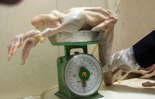 Quá trình kiểm tra tại xưởng, cảnh sát ghi nhận một nhân viên đang bơm hơi vào bụng gia cầm qua một đường ống nhựa. Vịt sau khi được bơm hơi thân mình căng tròn, trọng lượng tăng không đáng so với trước đó. |