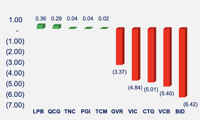 Các nhóm ngành đồng giảm đồng loạt, nhóm ngân hàng gây ảnh hưởng lớn nhất đến chỉ số, lần lượt là BID, CTG, VCB. Khối ngoại bán ròng hơn 1.500 tỷ đồng, cổ phiếu VHM và FUEVFVND (chứng chỉ quỹ VN-Diamond) bị bán mạnh nhất với giá trị bán ròng lần lượt 677 tỷ đồng và 384 tỷ đồng.