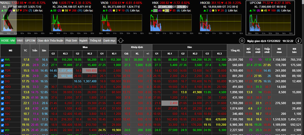Mở cửa phiên giao dịch 13/12, nhiều cổ phiếu chịu áp lực bán khá mạnh, trong đó có một số cổ phiếu bất động sản mới quay đầu hồi phục vài phiên trước như: Bất động sản Phát Đạt (PDR), DIC Corp. (DIG), Vingroup (VIC), Vinhomes (VHM), NHA, Đất Xanh (DXG)…
