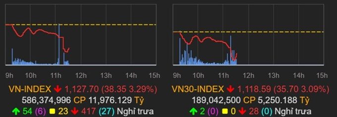 VN-Index mất 21 điểm lúc 11h. Tâm lý xả hàng theo đám đông khiến chỉ số tiếp tục rơi mạnh xuống vùng 1.121 điểm, mất hơn 45 điểm so với tham chiếu trong ít phút trước giờ nghỉ trưa. Chỉ số sau đó hồi phục nhẹ, trở lại vùng 1.127 điểm.