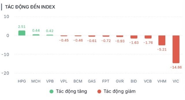 Đà giảm của thị trường chủ yếu xuất phát từ nhóm cổ phiếu trụ cột. Trong rổ VN30, nhiều mã vốn hóa lớn đồng loạt giảm sâu, kéo VN-Index mất gần 10 điểm. Đáng chú ý, VIC giảm gần 7% và VHM giảm hơn 6%, trở thành hai mã gây tác động tiêu cực nhất đến chỉ số chung. Bên cạnh đó, các mã ngân hàng và công nghệ như VCB (-1,39%), BID (-2,03%), FPT (-gần 2%) tiếp tục tạo sức ép lên thị trường.